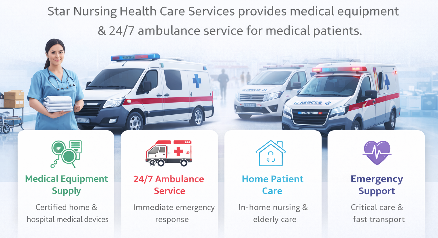 At Star Nursing Health Care Services, we focus on delivering fast, safe, and dependable healthcare solutions. Whether you need medical equipment at home or an emergency ambulance, our team is always ready to serve.